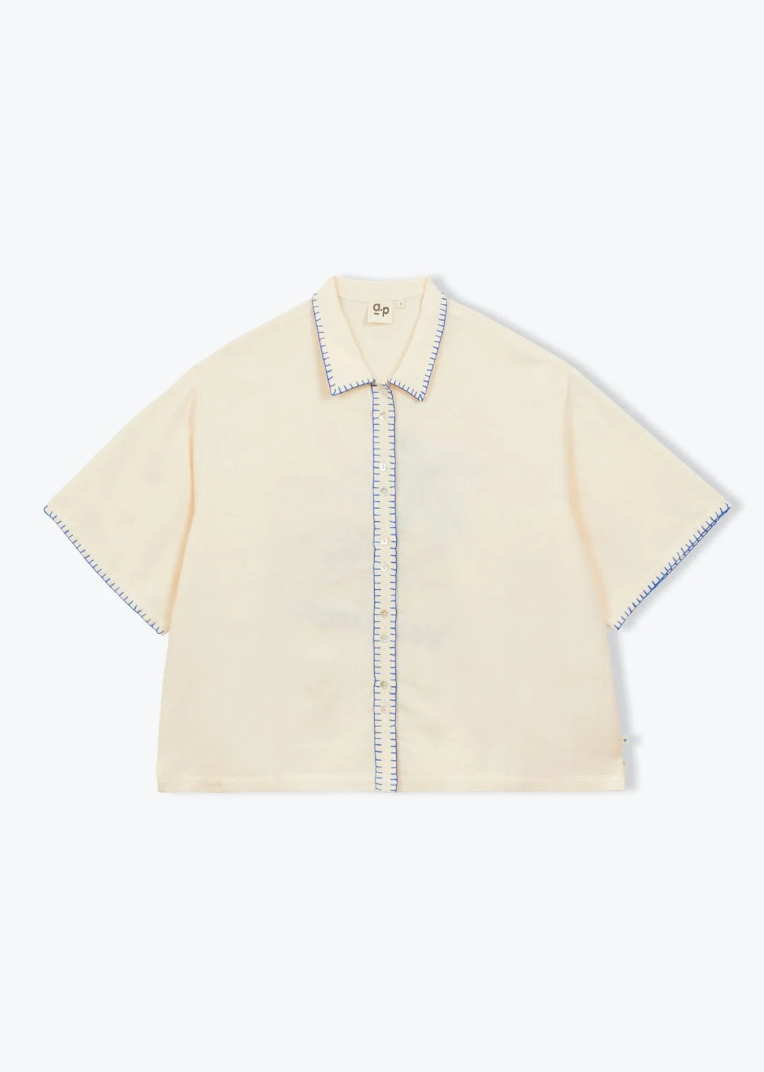 Broderie en coton bleu électrique sur le bord des manches, le col et la patte de boutonnage