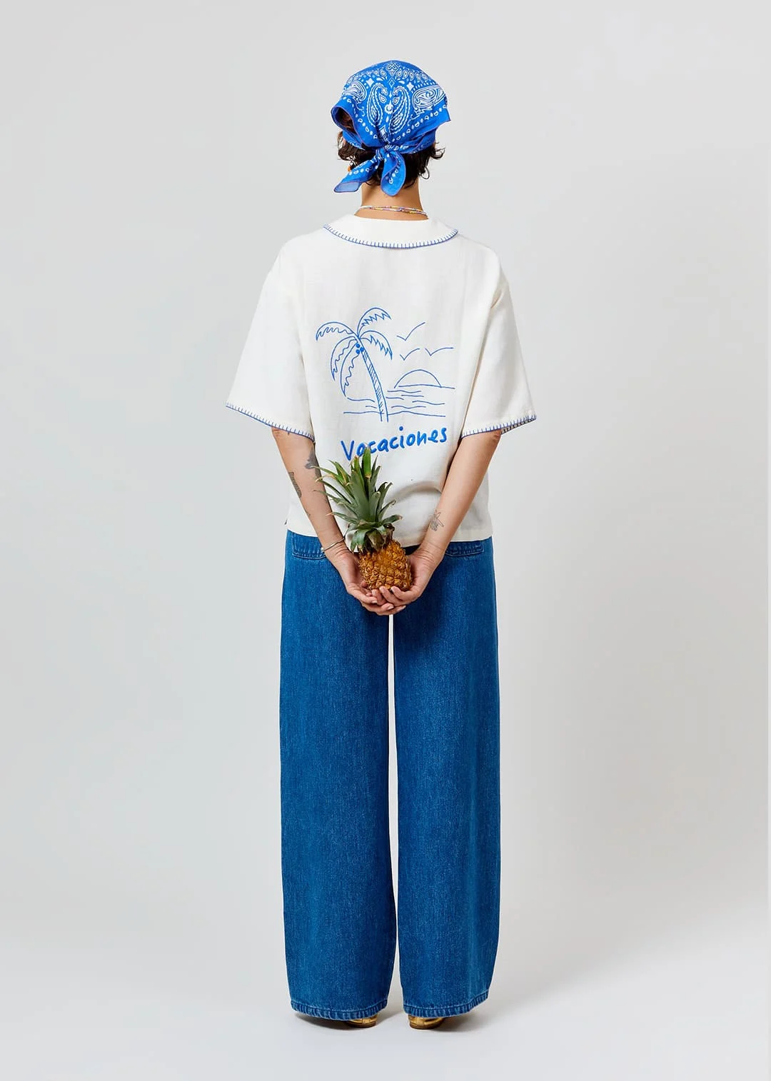 Broderie bleu électrique Vacaciones motif palmier dans le dos.